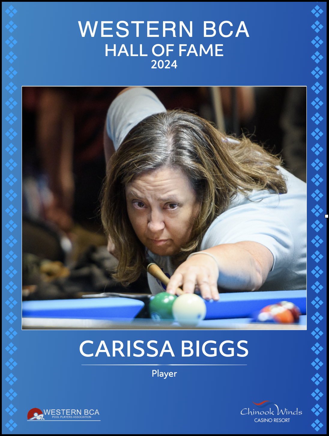Carissa Biggs was inducted in the 2024 class. Carissa has been a mainstay at Western BCA events in Lincoln City since the late 1990’s. She is an eleven time Western BCA plaque winner with at least four runner up finishes. One of her proud achievements is winning the 2015 BCAPL National 8 Ball Women’s Advanced/Master Teams at the Rio All-Suite Hotel & Casino in Las Vegas. She also won the 2014 NWPA 4th Annual Martha Hartsell Memorial tournament. Even with all her championships on the table, she may be best known on the west coast and nationally for her accomplishments off the table, giving back tirelessly throughout the years, supporting her family as a business owner, pool publicist, tournament director and even dipped her toes in streaming tournaments. She developed and published the On The Wire pool newspaper for nearly a decade along with creating Biggelbach’s in recent years, which provides pool equipment and accessories to pool players all over the country. You can see their booth regularly in Lincoln City and Las Vegas in both APA and BCA events. They bring all the newest products, all major cue brands and very nice upscale custom cues to pool players far and wide.
