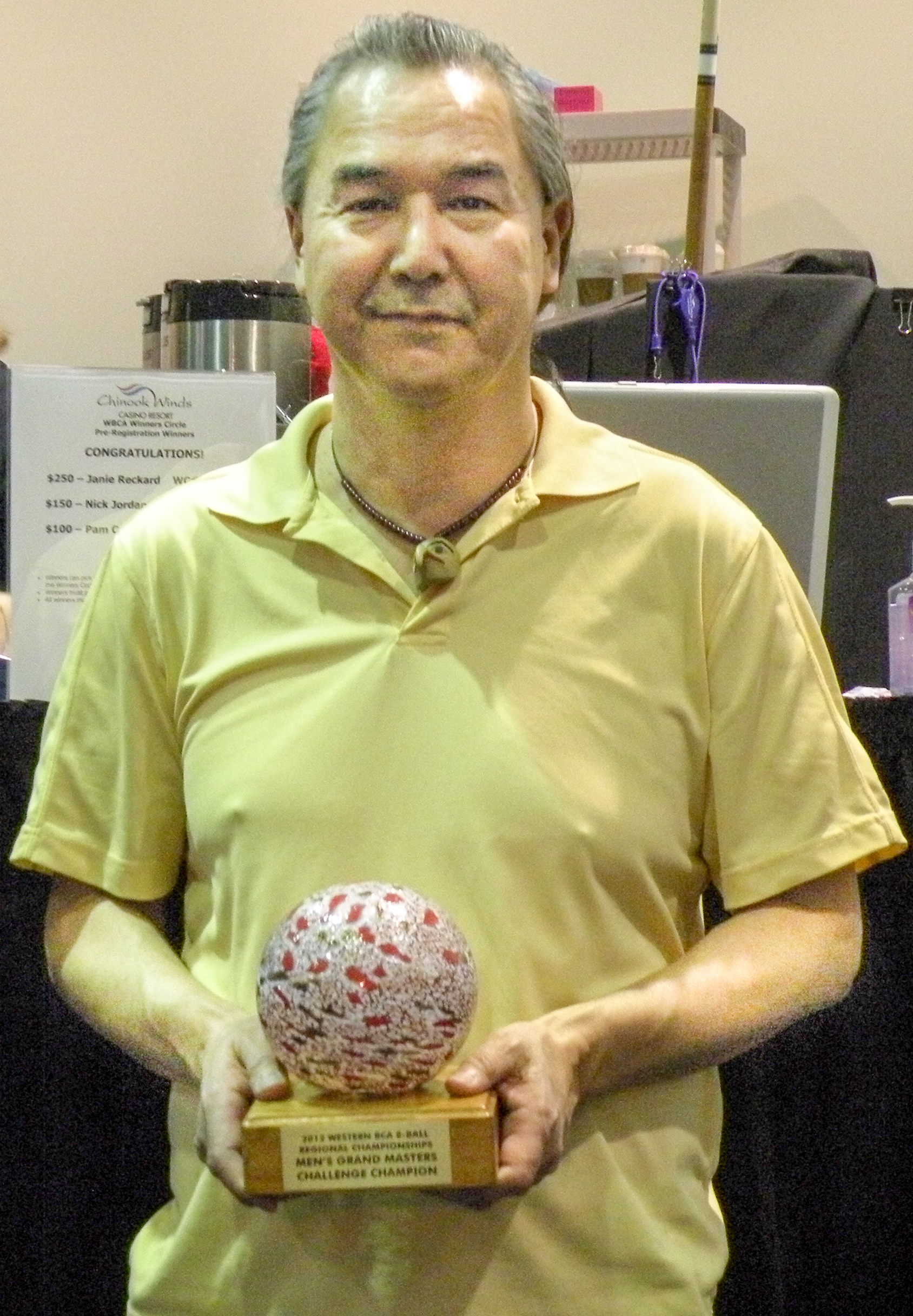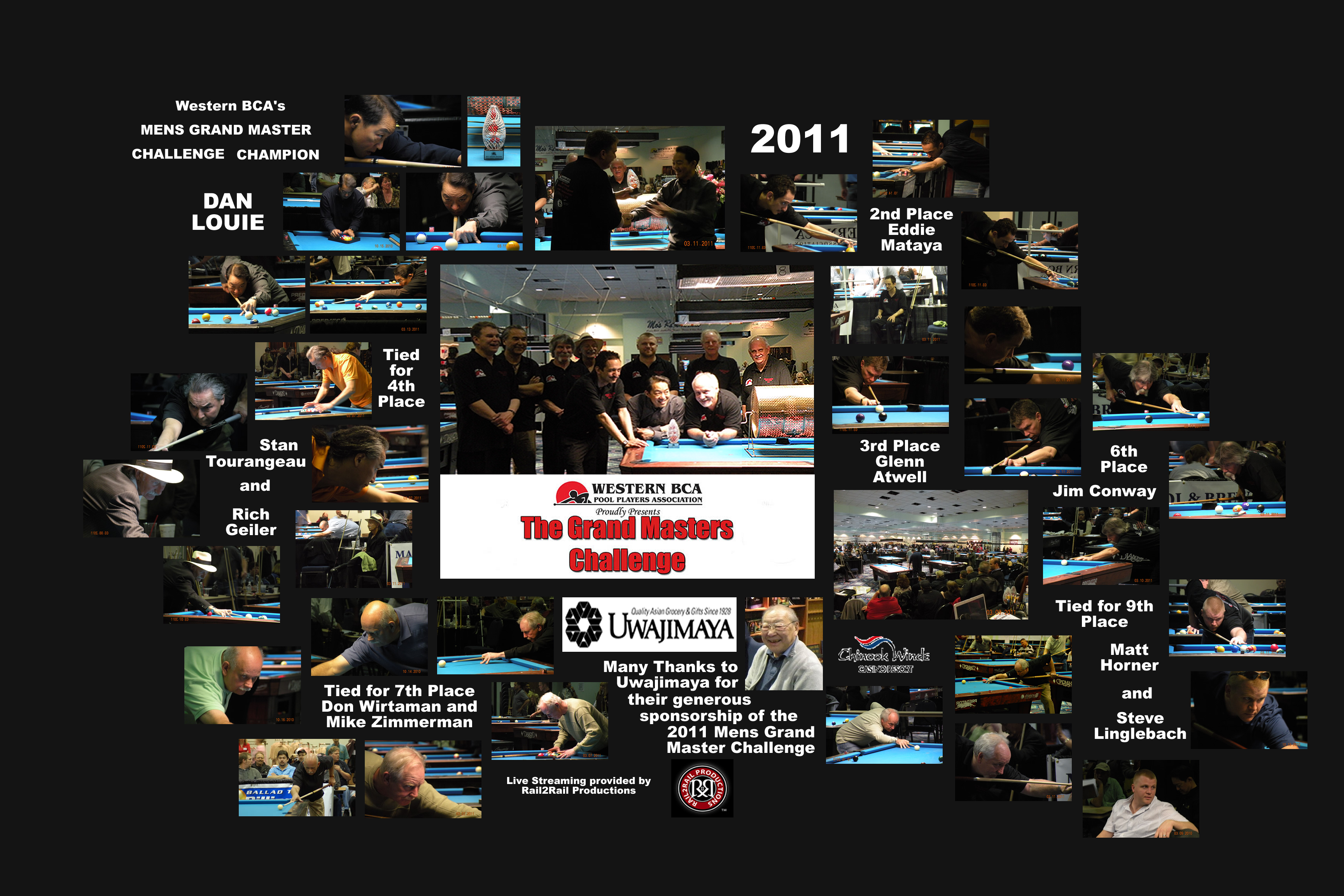 Western BCA introduced a new event at the 15th Annual Regional 8-Ball Championships. The Grand Master Challenge made its debut on March 9 at the beautiful Chinook Winds Casino Resort. Eight of the Northwest’s top-ranked Grand Master and Master players were invited to take part in this very special event and battle it out on the pool table for $6,300 in prize money. Cue Sports International/BCA Pool League and Western BCA Pool Players Association sponsored this event. All of the prize money was raised independently, with no money being taken from the Regional Tournament’s players. The players: Glenn Atwell, Rich Geiler, Matt Horner, Dan Louie, Todd Marsh, Eddie Mataya, Don Wirtaman, & Bob Zack. On Tuesday, March 9 at 2:00 in the afternoon, action got underway with young guns Matt Horner and Eddie Mataya doing battle on table #1 and experienced veterans Todd Marsh and Dan Louie showing their skills on table #2. Many onlookers entered a “Pick the Winner” contest. For a $5 contribution they could try to pick the order they thought the competitors would finish. All money raised went into the prize money for the GMC. Some of those predictions took a severe hit when Marsh and Horner each scored 7-3 wins and let everyone know this was anybody’s event to win. Two rounds were completed on Day 1 of the event with Glenn Atwell and Matt Horner sharing the lead with 13 wins each. Rich Geiler was only one game back with 12 wins and Todd Marsh had a total of 10. Day 2 brought more great pool action which was enjoyed not only by those who could attend the event in Lincoln City, but also by those who were unable to make it. The Northwest Women’s Poolplayers Association (NWPA) provided live streaming on the web, via U-STREAM.COM. Viewers at home were able to watch all the commentated matches and chat with the commentators. NWPA recorded over 4,100 hits in the 5 days of live streaming. When the dust had settled on the second day of the GMC, 5 of the 7 rounds were in the books and once again Glenn Atwell led all competitors with 33 wins, Don Wirtaman and Matt Horner were tied for second with 27 and Rich Geiler was still in the hunt with 26. The final day continued to showcase more great pool action as the players finished out the final two rounds. Glenn could smell the finish line and was not about to let his lead slip away. He finished like a true champion, with two monstrous 7-3 wins over Rich Geiler and Dan Louie and a total of 47 wins overall, to take the title of Grand Master Challenge Champion and the $2,000 paycheck that came with the title. Todd Marsh rode a couple of 6-4 wins over Eddie Mataya and Don Wirtaman to finish in a tie with Wirtaman for second place with 36 total wins. Rich Geiler made a very respectable return to this event with his 35 wins and a 4th place finish. Matt Horner finished in the 5th spot with 33 total wins. Dan Louie and Eddie Mataya finished tied with 32 wins and Bob Zack, who fought through the stomach flu, hung in to battle and finished with 29 total wins. The players were all very excited about this event and look forward to competing in it again. Many Master players were also excited and are hoping to earn their chance to be a part of this event in the future. |