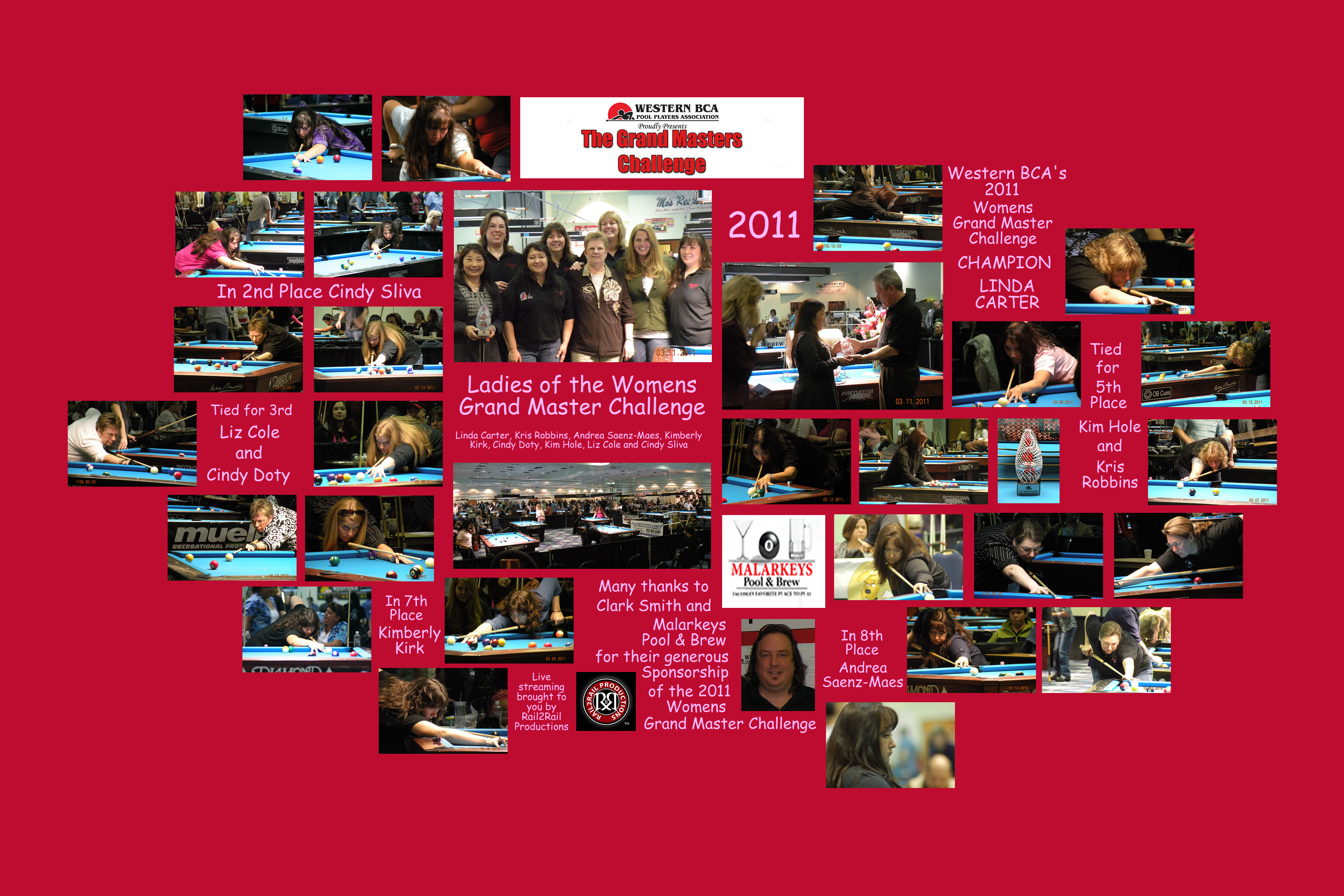 The GrandMaster Women would also play a triple elimination format for a total purse of $3000. In the new Women's GrandMaster Division there were 7 GrandMasters (Carissa Biggs, Linda Carter, Liz Cole, Cindy Doty, Kimberly Kirk, Andrea Saenz-Maes and Cindy Sliva) and 1 Master (Karla Bagley-Tias) playing for a 1st place prize of $1000. Play got underway on Wednesday morning with 4 matches and the race was on. Kimberly and Liz got off to the best start, winning their 1st two matches. Karla and Carissa made it tough on themselves by losing their first two matches. Karla won a tough match against Cindy D. before leaving the competition with a loss to Carissa. Carissa fared somewhat better, winning three matches before bowing out. Linda and Cindy D. were only able to win one match apiece before being put out. Andrea fared slightly better, winning two matches before being eliminated. It had by now become evident that the two front runners were Cindy S. and Kimberly with Liz and Carissa trying to keep up with them. Liz and Carissa, both with records of 3 wins and 3 losses, finished in 3rd ($575) and 4th ($375) respectively. Kimberly, the early favorite, had but one major obstacle between her and the top prize and her name was Cindy Sliva. Cindy S., on her way to the Triple Crown (1st place finishes in all events - singles, scotch and teams) was on a mission and would not be denied. Kimberly was her only loss early on (2nd match) and they would meet three more times before it was over, with Cindy S. winning all three of these matches. Kimberly graciously accepted her 2nd place check for $850. Cindy S. claimed the 1st place trophy and the $1000 check and will reign as Champion until the next time the GrandMaster Women go head to head. |