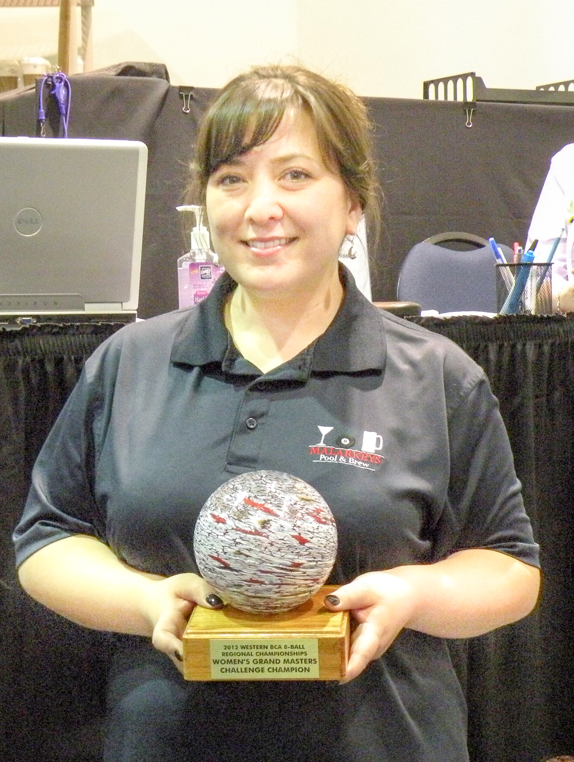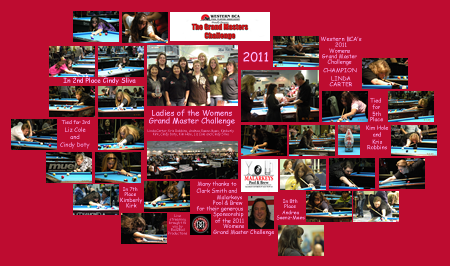 The GrandMasters went head to head on the front four tables during the 2011 9-Ball Championships. After the overwhelming success of the previous GrandMasters Challenges, this one did not disappoint. The play on the tables was at all times masterful with a smattering of brilliance thrown in now and then. The GrandMasters Challenges were created to give the GrandMasters and top Masters in Western BCA a truly competitive experience with a round-robin format tournament. This GMC, the first at a 9-Ball Regional event, was sponsored by Tiger Products who also donated one of their fine cues which was raffled and won by Scott Virgin (CC). Many thanks to Tiger Products for their generous support of Western BCA. The players played sets of 8 games, with the wins tallied at the end. After 3 days of stellar shooting and grueling safety battles, Liz Cole rose to the tope of the ladies’ field and Glenn Atwell topped the men’s division to capture the titles of GrandMasters Challenge Champions and take home beautiful blown glass trophies as well as the top prize money. The women played 9-Ball and Liz Cole got off to a great start and found herself on top after the first day. Her opponents noticed her exceptional play early on, with amazing combos and awesome run-outs, and they knew she would definitely be the one to catch at the end. 2011 8-Ball GMC Champion Linda Carter came within 3 points of catching Liz, but was unable to close the gap. Linda, as the previous winner, graciously presented Liz with her Championship trophy. Likewise, on the Men’s side, Glenn Atwell started out strong and never let up as he charged to victory. His steady stroke, calm demeanor and deadly accuracy gave him a strong lead. Dan Louie, the defending champion from the 2011 8-Ball GMC, made a valiant attempt to surpass Glenn in points, but fell short by 4 points. Dan Louie, as winner of the previous Mens GMC and ever the gentleman, presented Glenn with his 1st place trophy. |